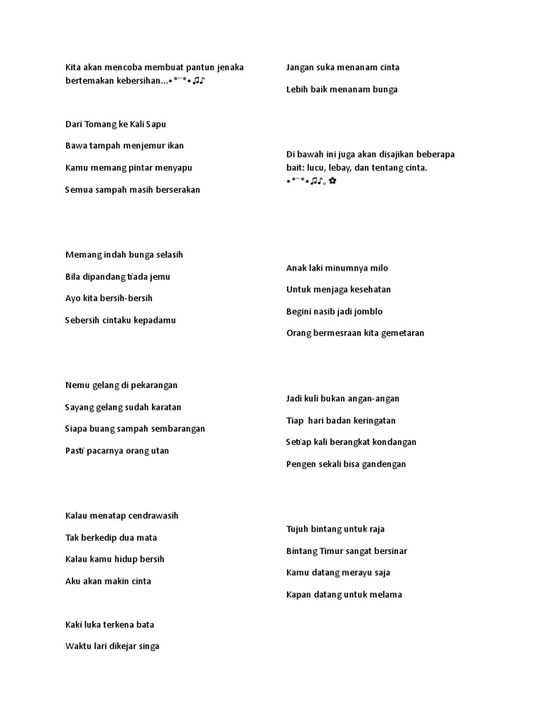 Kumpulan contoh pantun jenaka, pantun nasehat, teka teki, agama, pendidikan, cinta, romantis, persahabatan, perpisahan, ulang tahun, anak dll. Pergilah ke tepi kali jangan lupa bawa guci bangkitlah anak pertiwi bangunlah negerimu ini. Pantun jenaka anak smp tentang kebersihan. Tidak jauh berbeda dengan pantun jenaka, pantun lucu juga mempunyai unsur. Beli pempek cuko nyo basi.